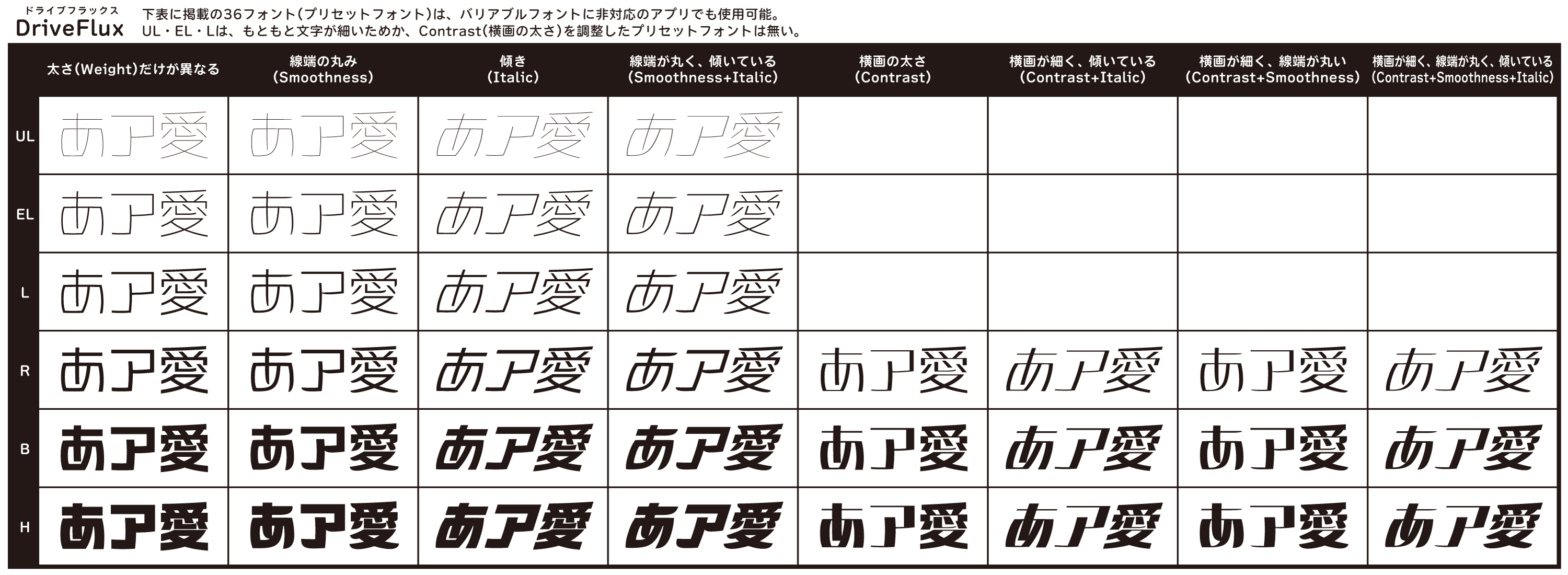 「DriveFlux」は、文字の太さ(Weight)、点・はらいなどの丸み(Smoothness)、
